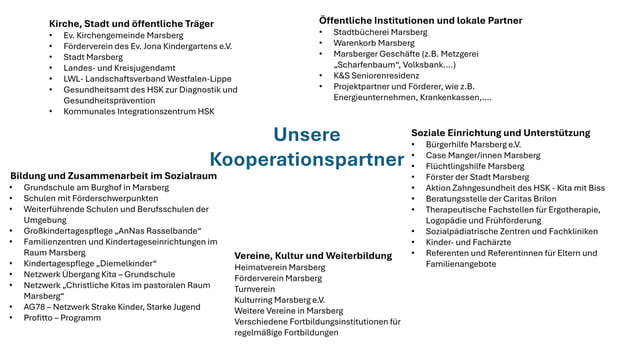 Ein wesentlicher Bestandteil unserer Arbeit ist die enge Zusammenarbeit mit Partnern aus Kirche, Kommune, Bildung und Gesundheit.